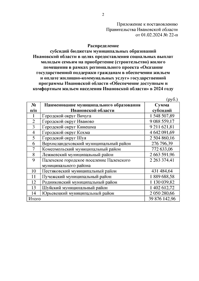 Постановление Правительства Ивановской области от 01.02.2024 N 22-п "О распределении субсидий бюджетам муниципальных образований Ивановской области в целях предоставления социальных выплат молодым семьям на приобретение (строительство) жилого помещения в рамках регионального проекта "Оказание государственной поддержки гражданам в обеспечении жильем и оплате жилищно-коммунальных услуг" государственной программы Ивановской области "Обеспечение доступным и комфортным жильем населения Ивановской области" в 2024 году"