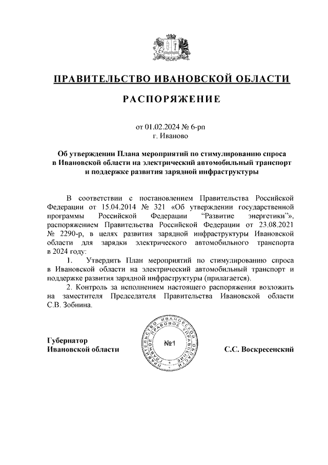 Распоряжение Правительства Ивановской области от 01.02.2024 N 6-рп "Об утверждении Плана мероприятий по стимулированию спроса в Ивановской области на электрический автомобильный транспорт и поддержке развития зарядной инфраструктуры"