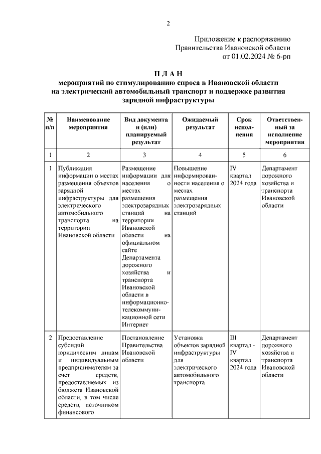 Распоряжение Правительства Ивановской области от 01.02.2024 N 6-рп "Об утверждении Плана мероприятий по стимулированию спроса в Ивановской области на электрический автомобильный транспорт и поддержке развития зарядной инфраструктуры"