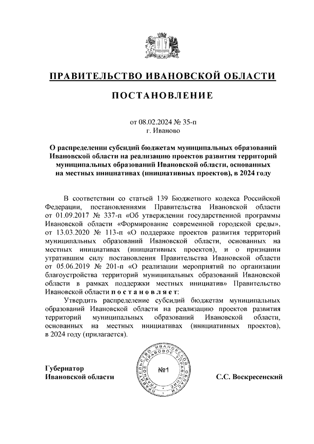 Постановление Правительства Ивановской области от 08.02.2024 N 35-п "О распределении субсидий бюджетам муниципальных образований Ивановской области на реализацию проектов развития территорий муниципальных образований Ивановской области, основанных на местных инициативах (инициативных проектов), в 2024 году"