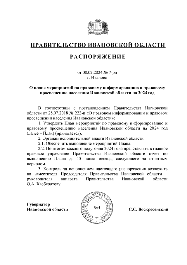 Распоряжение Правительства Ивановской области от 08.02.2024 N 7-рп "О плане мероприятий по правовому информированию и правовому просвещению населения Ивановской области на 2024 год"