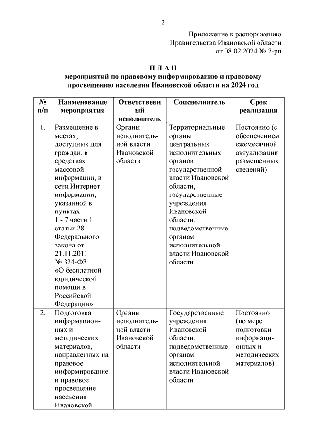 Распоряжение Правительства Ивановской области от 08.02.2024 N 7-рп "О плане мероприятий по правовому информированию и правовому просвещению населения Ивановской области на 2024 год"