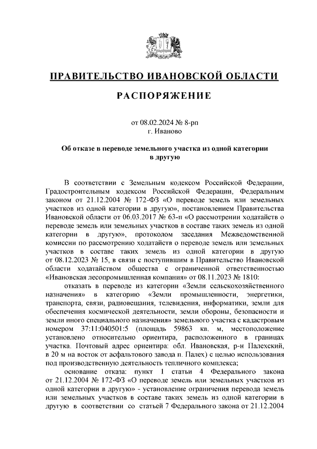 Распоряжение Правительства Ивановской области от 08.02.2024 N 8-рп "Об отказе в переводе земельного участка из одной категории в другую"