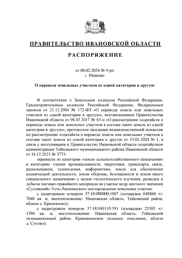 Распоряжение Правительства Ивановской области от 08.02.2024 N 9-рп "О переводе земельных участков из одной категории в другую"