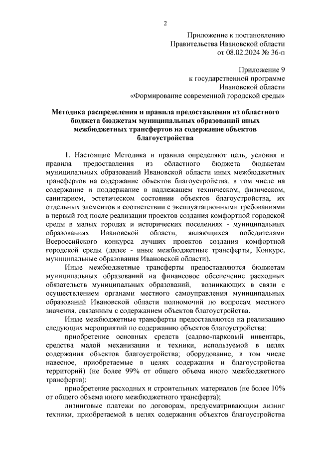 Постановление Правительства Ивановской области от 08.02.2024 N 36-п "Об установлении расходного обязательства и внесении изменения в постановление Правительства Ивановской области от 01.09.2017 N 337-п "Об утверждении государственной программы Ивановской области "Формирование современной городской среды" (вместе с "Методикой распределения и правилами предоставления из областного бюджета бюджетам муниципальных образований иных межбюджетных трансфертов на содержание объектов благоустройства")