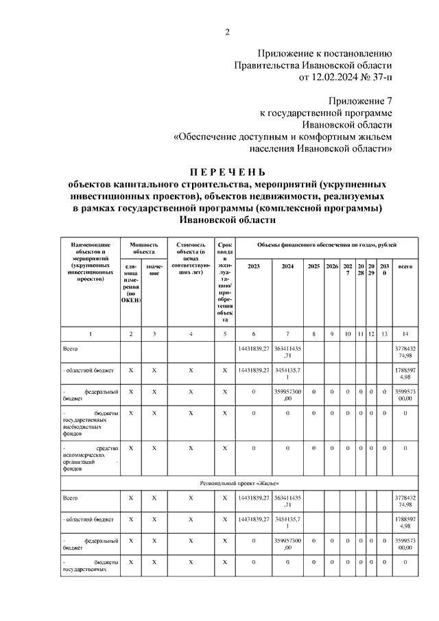 Постановление Правительства Ивановской области от 12.02.2024 N 37-п "О внесении изменения в постановление Правительства Ивановской области от 06.12.2017 N 460-п "Об утверждении государственной программы Ивановской области "Обеспечение доступным и комфортным жильем населения Ивановской области" (вместе с "Перечнем объектов капитального строительства, мероприятий (укрупненных инвестиционных проектов), объектов недвижимости, реализуемых в рамках государственной программы (комплексной программы) Ивановской области")