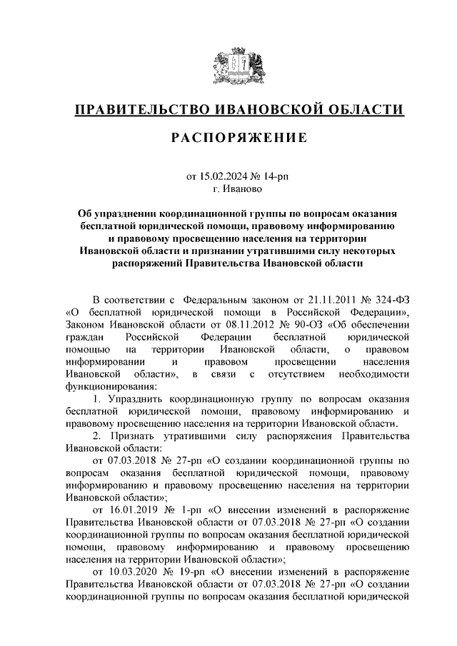 Распоряжение Правительства Ивановской области от 15.02.2024 N 14-рп "Об упразднении координационной группы по вопросам оказания бесплатной юридической помощи, правовому информированию и правовому просвещению населения на территории Ивановской области и признании утратившими силу некоторых распоряжений Правительства Ивановской области"