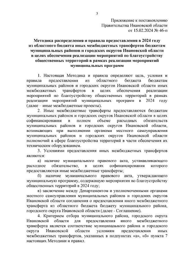 Постановление Правительства Ивановской области от 15.02.2024 N 46-п "Об установлении расходного обязательства Ивановской области и утверждении Методики распределения и правил предоставления в 2024 году из областного бюджета иных межбюджетных трансфертов бюджетам муниципальных районов и городских округов Ивановской области в целях обеспечения реализации мероприятий по благоустройству общественных территорий в рамках реализации мероприятий муниципальных программ"
