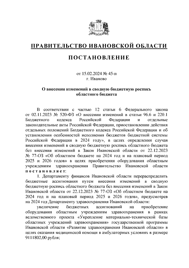 Постановление Правительства Ивановской области от 15.02.2024 N 45-п "О внесении изменений в сводную бюджетную роспись областного бюджета"