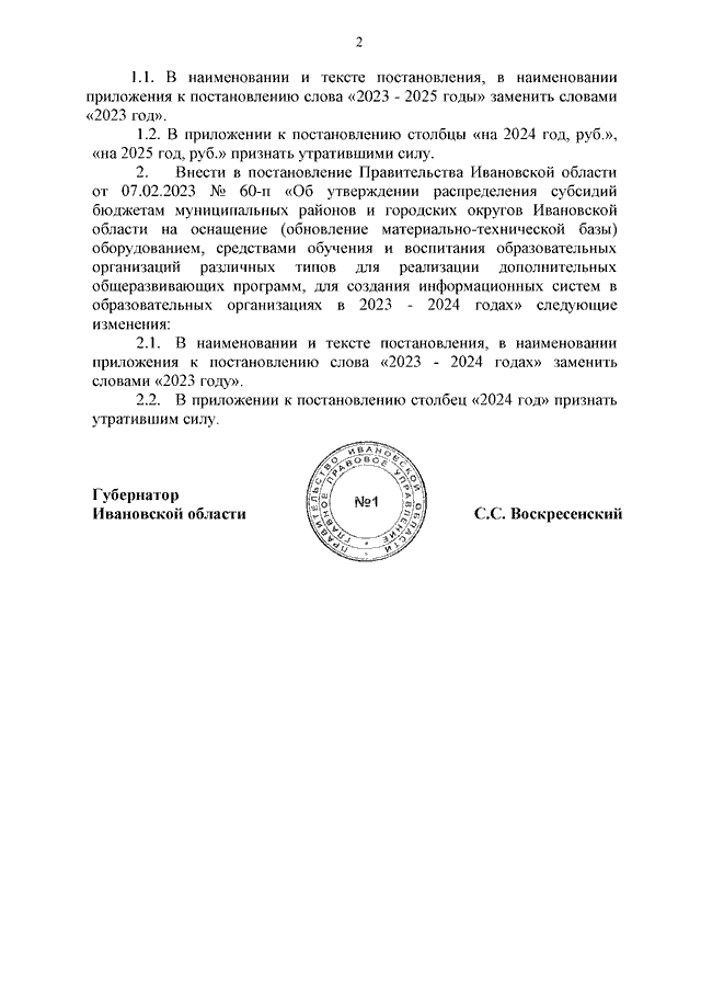Постановление Правительства Ивановской области от 15.02.2024 N 44-п "О внесении изменений в постановления Правительства Ивановской области от 01.02.2023 N 27-п "Об утверждении распределения иных межбюджетных трансфертов бюджетам муниципальных районов и городских округов Ивановской области на проведение мероприятий по обеспечению деятельности советников директора по воспитанию и взаимодействию с детскими общественными объединениями в муниципальных общеобразовательных организациях на 2023 - 2025 годы", от 07.02.2023 N 60-п "Об утверждении распределения субсидий бюджетам муниципальных районов и городских округов Ивановской области на оснащение (обновление материально-технической базы) оборудованием, средствами обучения и воспитания образовательных организаций различных типов для реализации дополнительных общеразвивающих программ, для создания информационных систем в образовательных организациях в 2023 - 2024 годах"