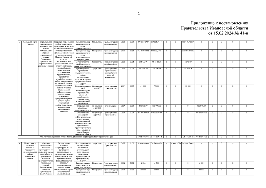 Постановление Правительства Ивановской области от 15.02.2024 N 41-п "О внесении изменений в постановление Правительства Ивановской области от 27.12.2021 N 697-п "Об утверждении детализированного перечня мероприятий, реализуемых в рамках инфраструктурных проектов, на финансовое обеспечение которых из федерального бюджета предоставляется бюджетный кредит"