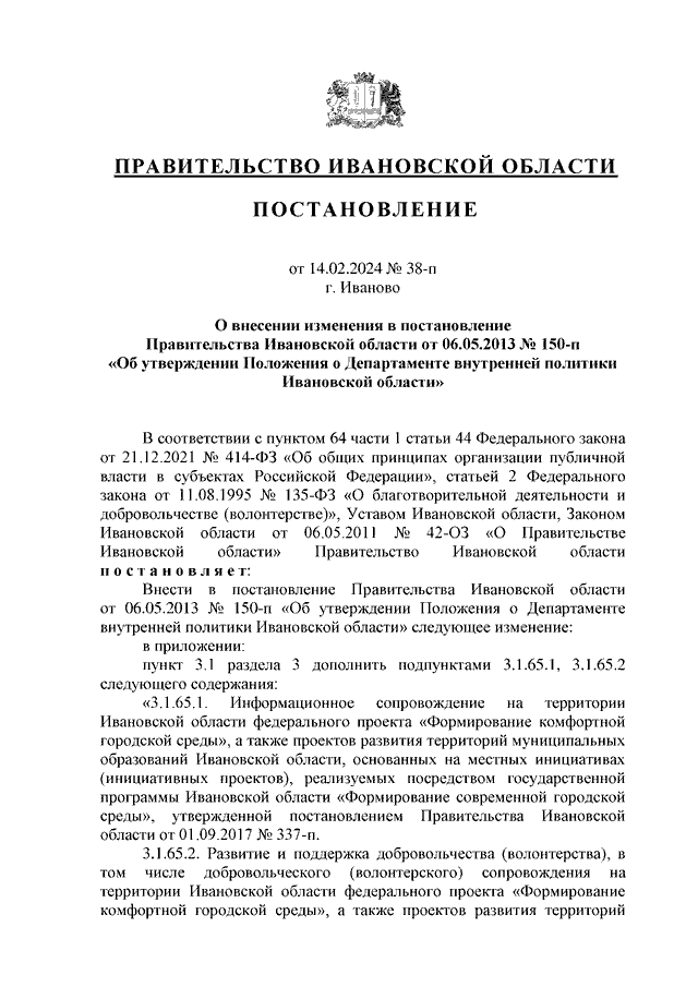 Постановление Правительства Ивановской области от 14.02.2024 N 38-п "О внесении изменения в постановление Правительства Ивановской области от 06.05.2013 N 150-п "Об утверждении Положения о Департаменте внутренней политики Ивановской области"