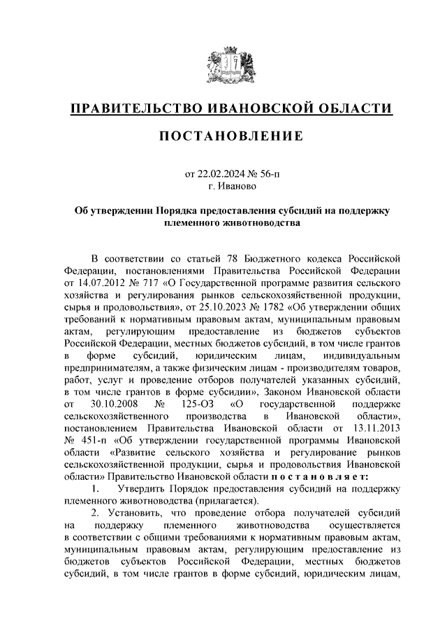 Постановление Правительства Ивановской области от 22.02.2024 N 56-п "Об утверждении Порядка предоставления субсидий на поддержку племенного животноводства"