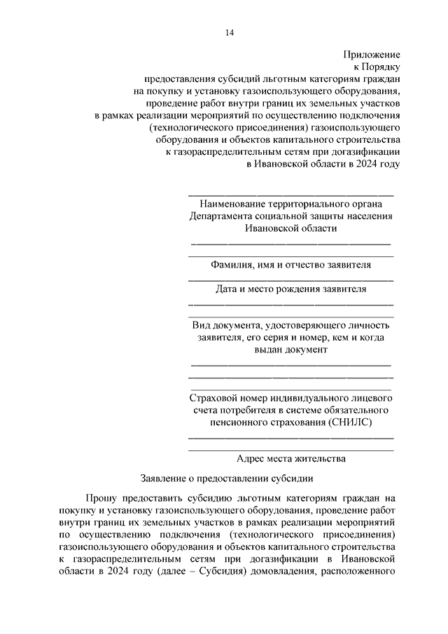 Постановление Правительства Ивановской области от 22.02.2024 N 52-п "О дополнительной мере социальной поддержки граждан в виде предоставления субсидий льготным категориям граждан на покупку и установку газоиспользующего оборудования, проведение работ внутри границ их земельных участков в рамках реализации мероприятий по осуществлению подключения (технологического присоединения) газоиспользующего оборудования и объектов капитального строительства к газораспределительным сетям при догазификации в Ивановской области в 2024 году" (вместе с "Порядком предоставления субсидий льготным категориям граждан на покупку и установку газоиспользующего оборудования, проведение работ внутри границ их земельных участков в рамках реализации мероприятий по осуществлению подключения (технологического присоединения) газоиспользующего оборудования и объектов капитального строительства к газораспределительным сетям при догазификации в Ивановской области в 2024 году")