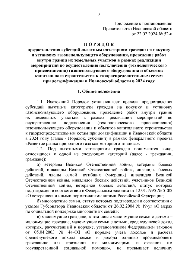 Постановление Правительства Ивановской области от 22.02.2024 N 52-п "О дополнительной мере социальной поддержки граждан в виде предоставления субсидий льготным категориям граждан на покупку и установку газоиспользующего оборудования, проведение работ внутри границ их земельных участков в рамках реализации мероприятий по осуществлению подключения (технологического присоединения) газоиспользующего оборудования и объектов капитального строительства к газораспределительным сетям при догазификации в Ивановской области в 2024 году" (вместе с "Порядком предоставления субсидий льготным категориям граждан на покупку и установку газоиспользующего оборудования, проведение работ внутри границ их земельных участков в рамках реализации мероприятий по осуществлению подключения (технологического присоединения) газоиспользующего оборудования и объектов капитального строительства к газораспределительным сетям при догазификации в Ивановской области в 2024 году")