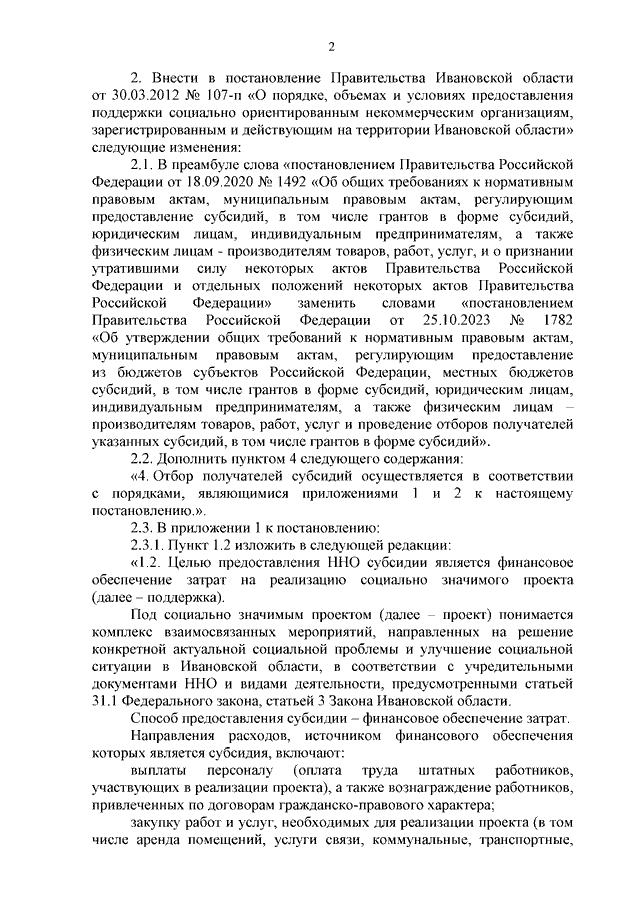 Постановление Правительства Ивановской области от 22.02.2024 N 62-п "О внесении изменений в постановление Правительства Ивановской области от 30.03.2012 N 107-п "О порядке, объемах и условиях предоставления поддержки социально ориентированным некоммерческим организациям, зарегистрированным и действующим на территории Ивановской области"