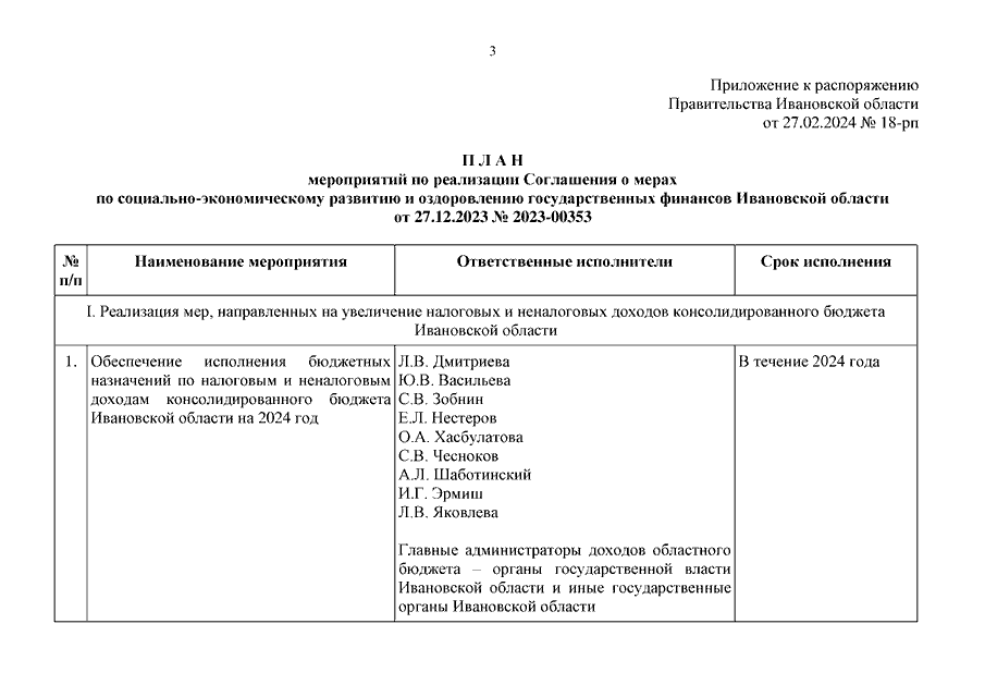 Распоряжение Правительства Ивановской области от 27.02.2024 N 18-рп "О реализации Соглашения о мерах по социально-экономическому развитию и оздоровлению государственных финансов Ивановской области" (вместе с "Планом мероприятий по реализации соглашения о мерах по социально-экономическому развитию и оздоровлению государственных финансов Ивановской области от 27.12.2023 N 2023-00353")