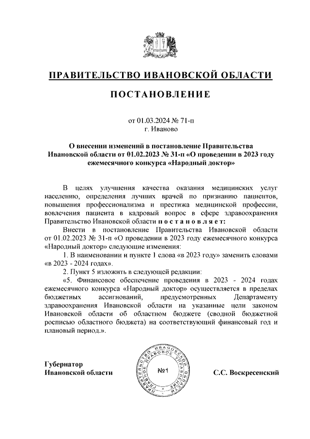Постановление Правительства Ивановской области от 01.03.2024 N 71-п "О внесении изменений в постановление Правительства Ивановской области от 01.02.2023 N 31-п "О проведении в 2023 году ежемесячного конкурса "Народный доктор"