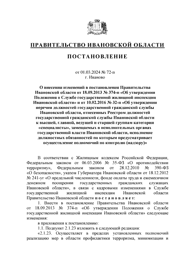 Постановление Правительства Ивановской области от 01.03.2024 N 72-п "О внесении изменений в постановления Правительства Ивановской области от 18.09.2013 N 374-п "Об утверждении Положения о Службе государственной жилищной инспекции Ивановской области" и от 10.02.2016 N 32-п "Об утверждении перечня должностей государственной гражданской службы Ивановской области, отнесенных Реестром должностей государственной гражданской службы Ивановской области к высшей, главной, ведущей и старшей группам категории "специалисты", замещаемых в исполнительных органах государственной власти Ивановской области, исполнение должностных обязанностей по которым предусматривает осуществление полномочий по контролю (надзору)"