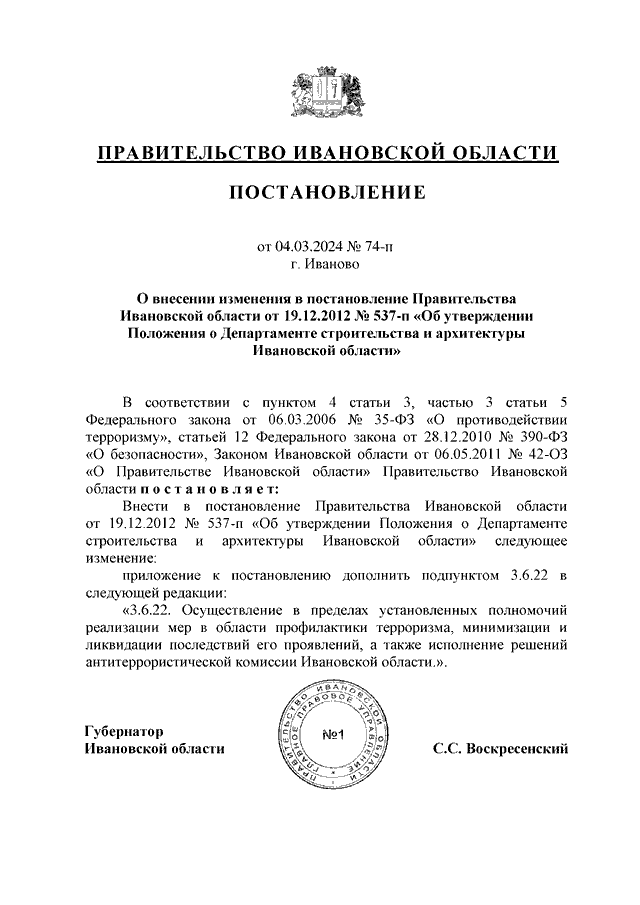 Постановление Правительства Ивановской области от 04.03.2024 N 74-п "О внесении изменения в постановление Правительства Ивановской области от 19.12.2012 N 537-п "Об утверждении Положения о Департаменте строительства и архитектуры Ивановской области"