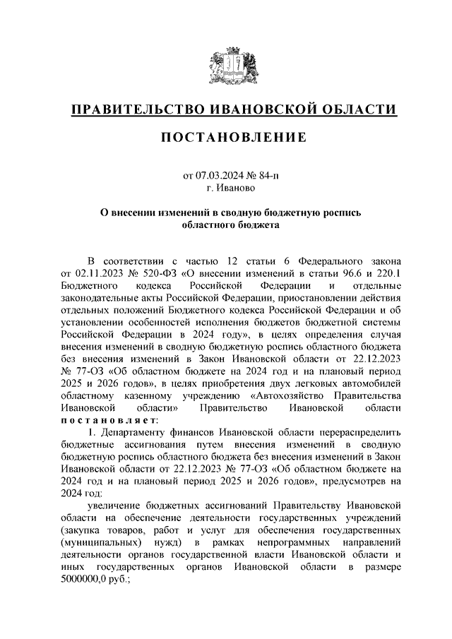 Постановление Правительства Ивановской области от 07.03.2024 N 84-п "О внесении изменений в сводную бюджетную роспись областного бюджета"