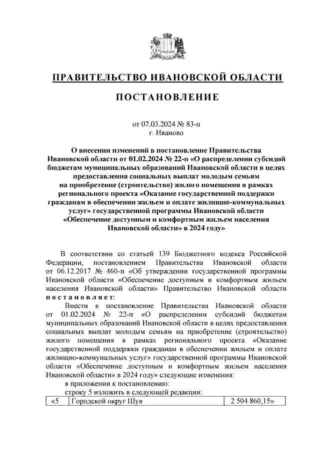 Постановление Правительства Ивановской области от 07.03.2024 N 83-п "О внесении изменений в постановление Правительства Ивановской области от 01.02.2024 N 22-п "О распределении субсидий бюджетам муниципальных образований Ивановской области в целях предоставления социальных выплат молодым семьям на приобретение (строительство) жилого помещения в рамках регионального проекта "Оказание государственной поддержки гражданам в обеспечении жильем и оплате жилищно-коммунальных услуг" государственной программы Ивановской области "Обеспечение доступным и комфортным жильем населения Ивановской области" в 2024 году"