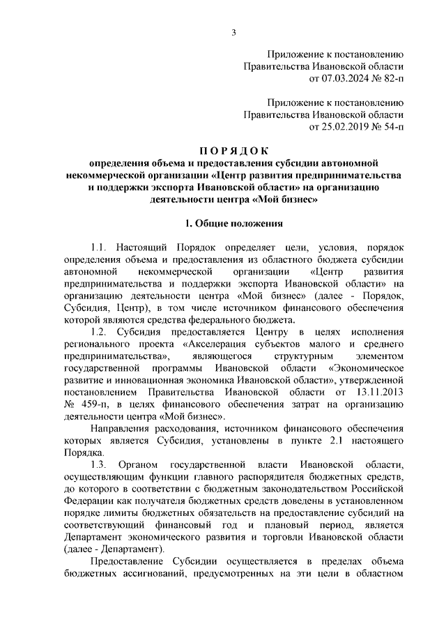 Постановление Правительства Ивановской области от 07.03.2024 N 82-п "О внесении изменений в постановление Правительства Ивановской области от 25.02.2019 N 54-п "Об утверждении Порядка определения объема и предоставления субсидии автономной некоммерческой организации "Центр развития предпринимательства и поддержки экспорта Ивановской области" на организацию деятельности центра "Мой бизнес"
