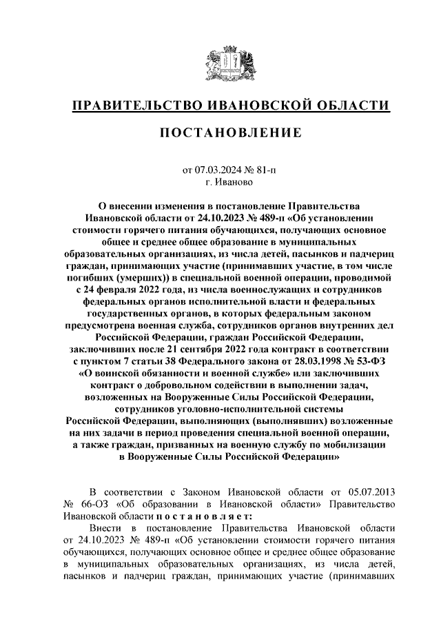Постановление Правительства Ивановской области от 07.03.2024 N 81-п "О внесении изменения в постановление Правительства Ивановской области от 24.10.2023 N 489-п "Об установлении стоимости горячего питания обучающихся, получающих основное общее и среднее общее образование в муниципальных образовательных организациях, из числа детей, пасынков и падчериц граждан, принимающих участие (принимавших участие, в том числе погибших (умерших)) в специальной военной операции, проводимой с 24 февраля 2022 года, из числа военнослужащих и сотрудников федеральных органов исполнительной власти и федеральных государственных органов, в которых федеральным законом предусмотрена военная служба, сотрудников органов внутренних дел Российской Федерации, граждан Российской Федерации, заключивших после 21 сентября 2022 года контракт в соответствии с пунктом 7 статьи 38 Федерального закона от 28.03.1998 N 53-ФЗ "О воинской обязанности и военной службе" или заключивших контракт о добровольном содействии в выполнении задач, возложенных на Вооруженные Силы Российской Федерации, сотрудников уголовно-исполнительной системы Российской Федерации, выполняющих (выполнявших) возложенные на них задачи в период проведения специальной военной операции, а также граждан, призванных на военную службу по мобилизации в Вооруженные Силы Российской Федерации"