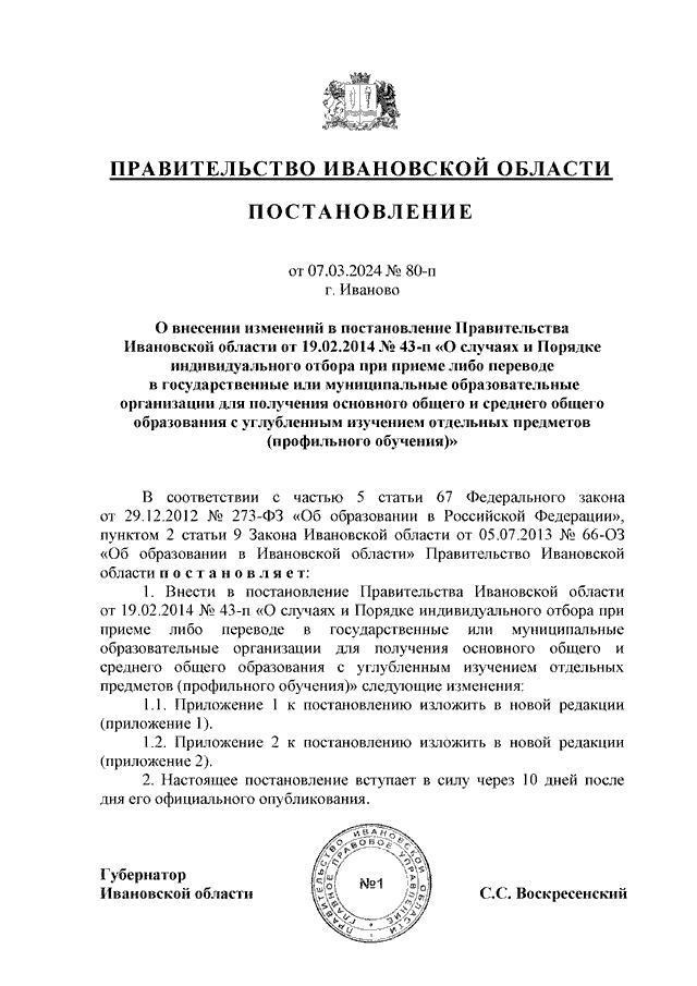 Постановление Правительства Ивановской области от 07.03.2024 N 80-п "О внесении изменений в постановление Правительства Ивановской области от 19.02.2014 N 43-п "О случаях и Порядке индивидуального отбора при приеме либо переводе в государственные или муниципальные образовательные организации для получения основного общего и среднего общего образования с углубленным изучением отдельных предметов (профильного обучения)"