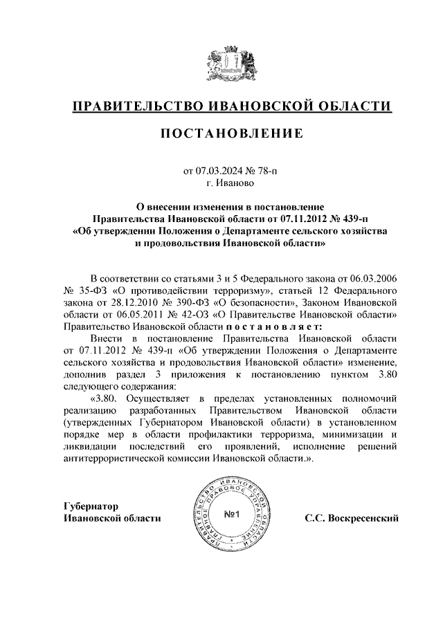 Постановление Правительства Ивановской области от 07.03.2024 N 78-п "О внесении изменения в постановление Правительства Ивановской области от 07.11.2012 N 439-п "Об утверждении Положения о Департаменте сельского хозяйства и продовольствия Ивановской области"