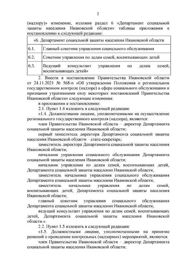 Постановление Правительства Ивановской области от 07.03.2024 N 77-п "О внесении изменений в постановления Правительства Ивановской области от 10.02.2016 N 32-п "Об утверждении перечня должностей государственной гражданской службы Ивановской области, отнесенных Реестром должностей государственной гражданской службы Ивановской области к высшей, главной, ведущей и старшей группам категории "специалисты", замещаемых в исполнительных органах государственной власти Ивановской области, исполнение должностных обязанностей по которым предусматривает осуществление полномочий по контролю (надзору)" и от 24.11.2021 N 568-п "Об утверждении Положения о региональном государственном контроле (надзоре) в сфере социального обслуживания и признании утратившими силу некоторых постановлений Правительства Ивановской области"