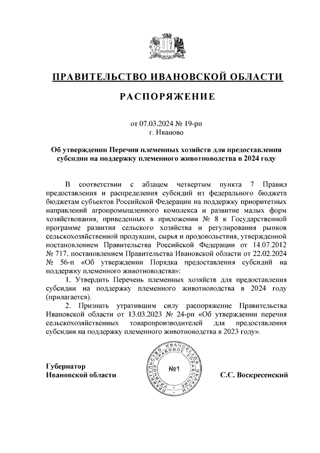 Распоряжение Правительства Ивановской области от 07.03.2024 N 19-рп "Об утверждении Перечня племенных хозяйств для предоставления субсидии на поддержку племенного животноводства в 2024 году" (вместе с "Перечнем сельскохозяйственных товаропроизводителей для предоставления субсидии на поддержку племенного животноводства в 2024 году")
