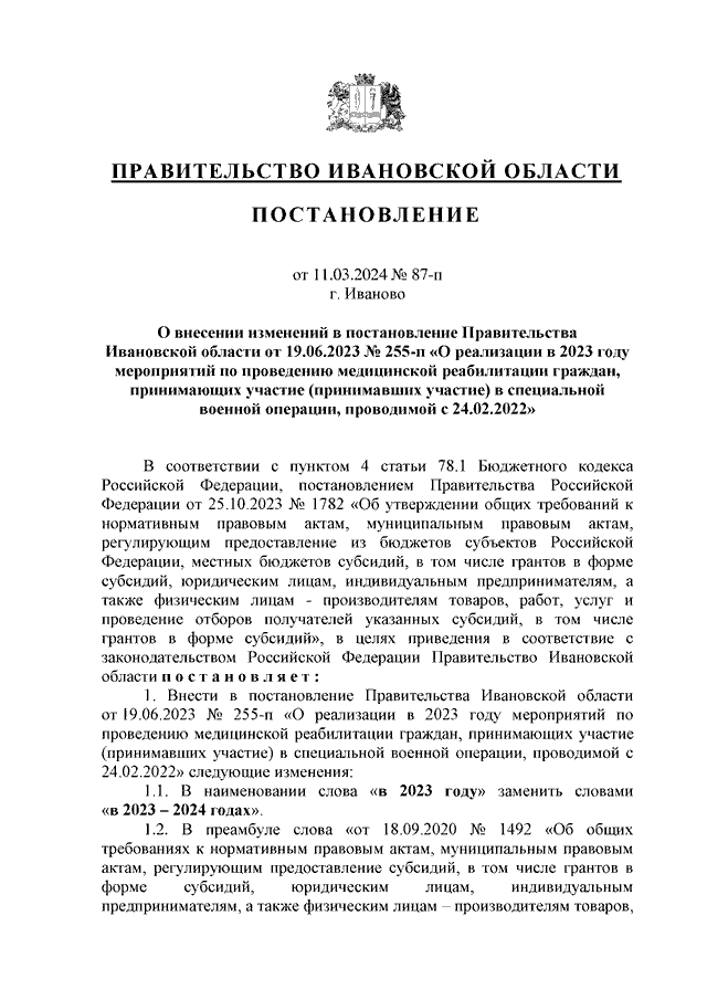 Постановление Правительства Ивановской области от 11.03.2024 N 87-п "О внесении изменений в постановление Правительства Ивановской области от 19.06.2023 N 255-п "О реализации в 2023 году мероприятий по проведению медицинской реабилитации граждан, принимающих участие (принимавших участие) в специальной военной операции, проводимой с 24.02.2022"