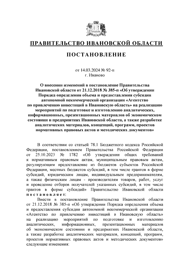 Постановление Правительства Ивановской области от 14.03.2024 N 92-п "О внесении изменений в постановление Правительства Ивановской области от 21.12.2018 N 385-п "Об утверждении Порядка определения объема и предоставления субсидии автономной некоммерческой организации "Агентство по привлечению инвестиций в Ивановскую область" на реализацию мероприятий по подготовке и изготовлению аналитических, информационных, презентационных материалов об экономическом состоянии и предприятиях Ивановской области, а также разработке аналитических материалов, концепций, программ, проектов нормативных правовых актов и методических документов"