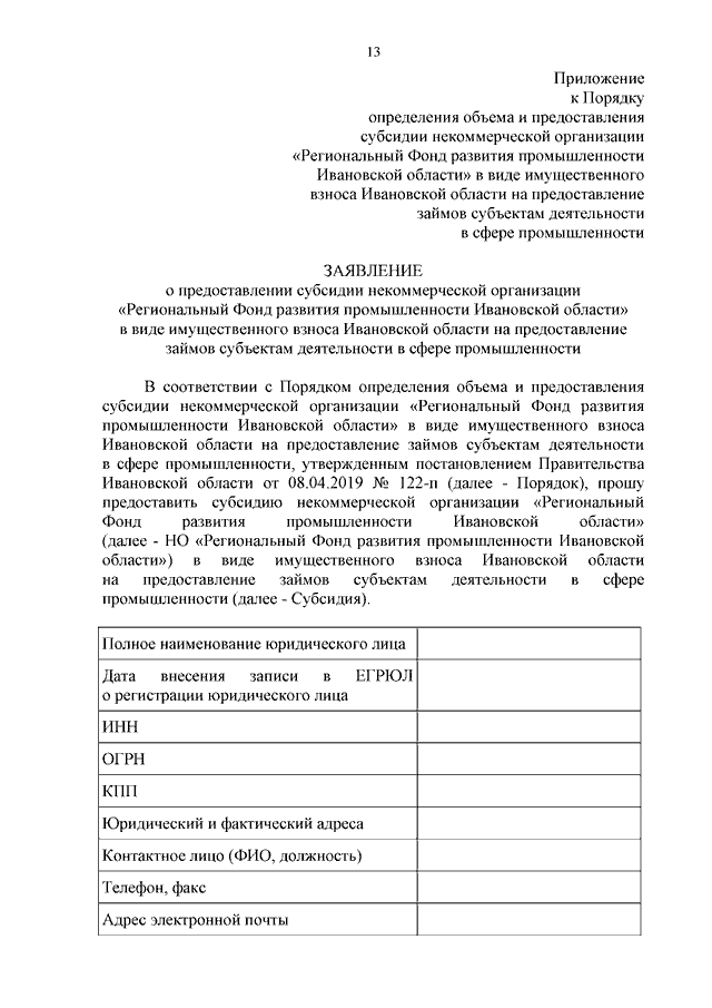 Постановление Правительства Ивановской области от 14.03.2024 N 91-п "О внесении изменений в постановление Правительства Ивановской области от 08.04.2019 N 122-п "Об утверждении Порядка определения объема и предоставления субсидии некоммерческой организации "Региональный Фонд развития промышленности Ивановской области" в виде имущественного взноса Ивановской области на предоставление займов субъектам деятельности в сфере промышленности"