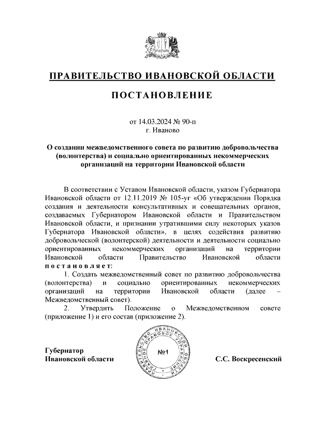 Постановление Правительства Ивановской области от 14.03.2024 N 90-п "О создании межведомственного совета по развитию добровольчества (волонтерства) и социально ориентированных некоммерческих организаций на территории Ивановской области" (вместе с "Положением о межведомственном совете по развитию добровольчества (волонтерства) и социально ориентированных некоммерческих организаций на территории Ивановской области")