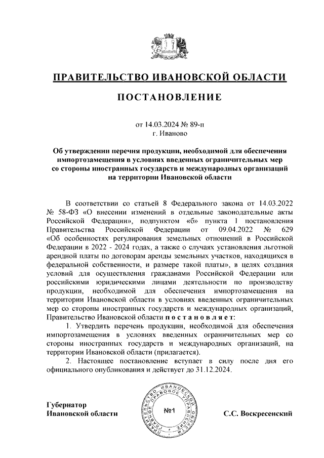 Постановление Правительства Ивановской области от 14.03.2024 N 89-п "Об утверждении перечня продукции, необходимой для обеспечения импортозамещения в условиях введенных ограничительных мер со стороны иностранных государств и международных организаций на территории Ивановской области"