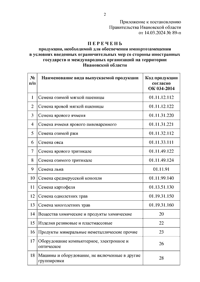 Постановление Правительства Ивановской области от 14.03.2024 N 89-п "Об утверждении перечня продукции, необходимой для обеспечения импортозамещения в условиях введенных ограничительных мер со стороны иностранных государств и международных организаций на территории Ивановской области"