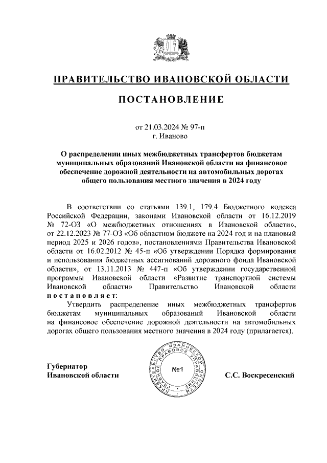 Постановление Правительства Ивановской области от 21.03.2024 N 97-п "О распределении иных межбюджетных трансфертов бюджетам муниципальных образований Ивановской области на финансовое обеспечение дорожной деятельности на автомобильных дорогах общего пользования местного значения в 2024 году"