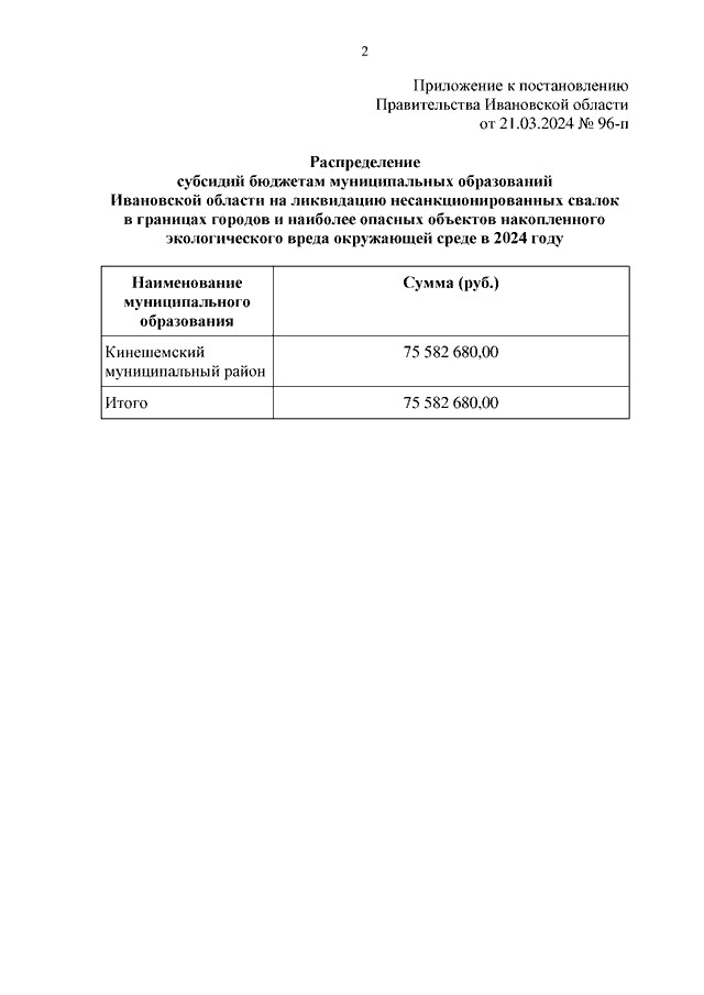 Постановление Правительства Ивановской области от 21.03.2024 N 96-п "Об утверждении распределения субсидий бюджетам муниципальных образований Ивановской области на ликвидацию несанкционированных свалок в границах городов и наиболее опасных объектов накопленного экологического вреда окружающей среде в 2024 году"