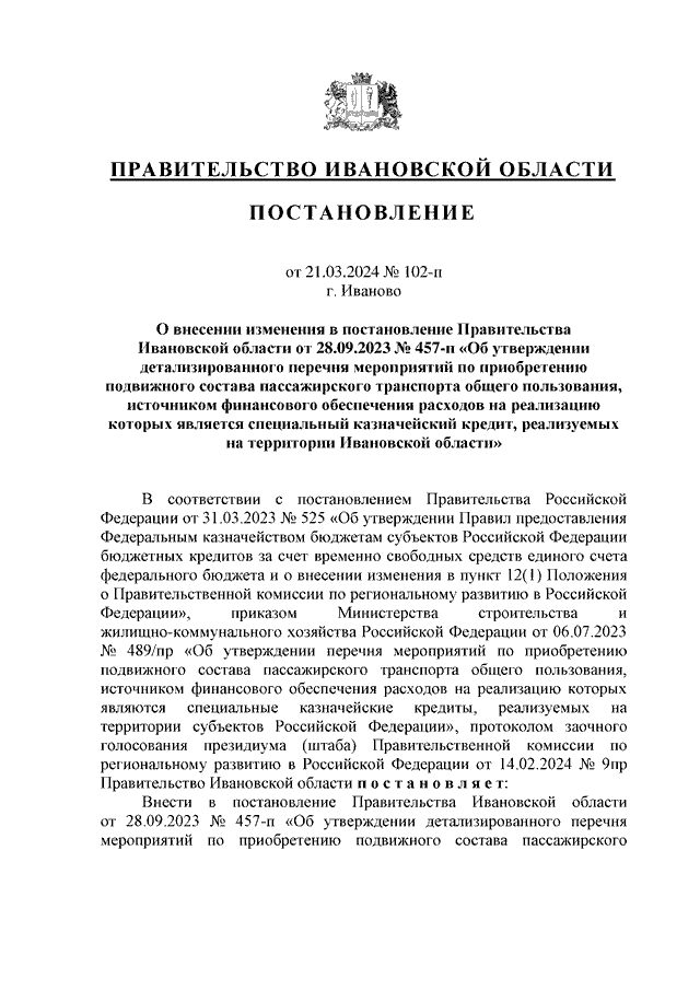 Постановление Правительства Ивановской области от 21.03.2024 N 102-п "О внесении изменения в постановление Правительства Ивановской области от 28.09.2023 N 457-п "Об утверждении детализированного перечня мероприятий по приобретению подвижного состава пассажирского транспорта общего пользования, источником финансового обеспечения расходов на реализацию которых является специальный казначейский кредит, реализуемых на территории Ивановской области"