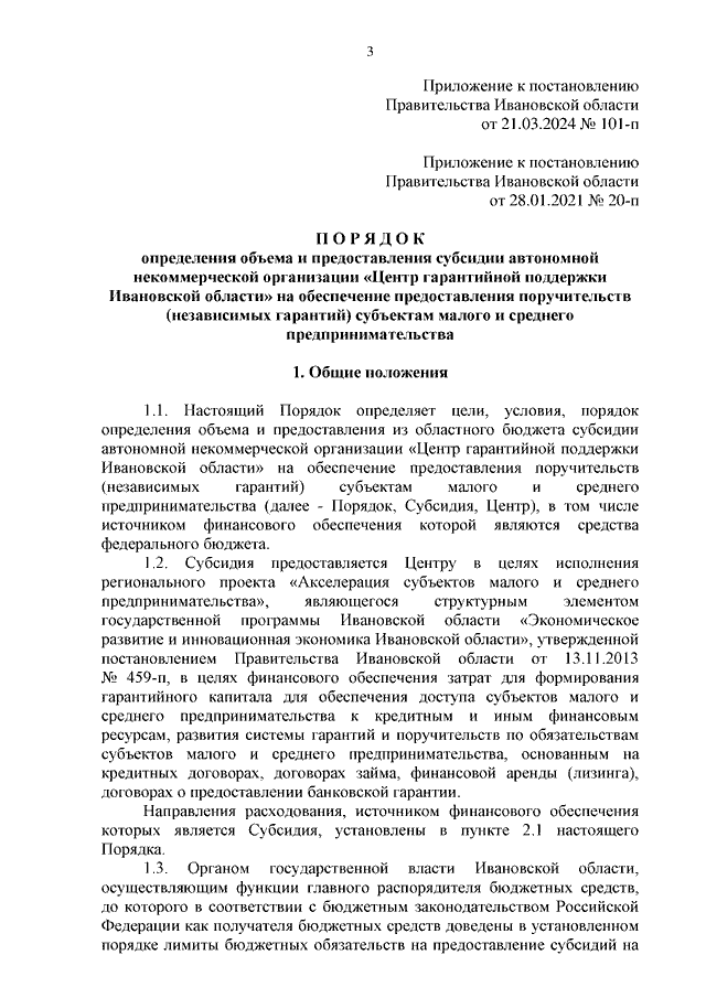 Постановление Правительства Ивановской области от 21.03.2024 N 101-п "О внесении изменений в постановление Правительства Ивановской области от 28.01.2021 N 20-п "Об утверждении Порядка определения объема и предоставления субсидии автономной некоммерческой организации "Центр гарантийной поддержки Ивановской области" на обеспечение исполнения обязательств по поручительствам, предоставленным в целях обеспечения исполнения обязательств субъектов малого и среднего предпринимательства" (вместе с "Порядком определения объема и предоставления субсидии автономной некоммерческой организации "Центр гарантийной поддержки Ивановской области" на обеспечение предоставления поручительств (независимых гарантий) субъектам малого и среднего предпринимательства")