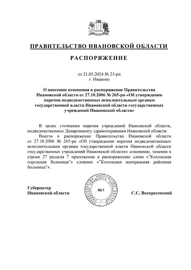 Распоряжение Правительства Ивановской области от 21.03.2024 N 23-рп "О внесении изменения в распоряжение Правительства Ивановской области от 27.10.2006 N 265-рп "Об утверждении перечня подведомственных исполнительным органам государственной власти Ивановской области государственных учреждений Ивановской области"
