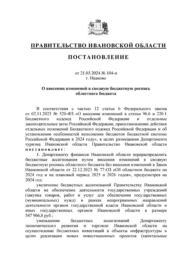 Постановление Правительства Ивановской области от 21.03.2024 N 104-п "О внесении изменений в сводную бюджетную роспись областного бюджета"