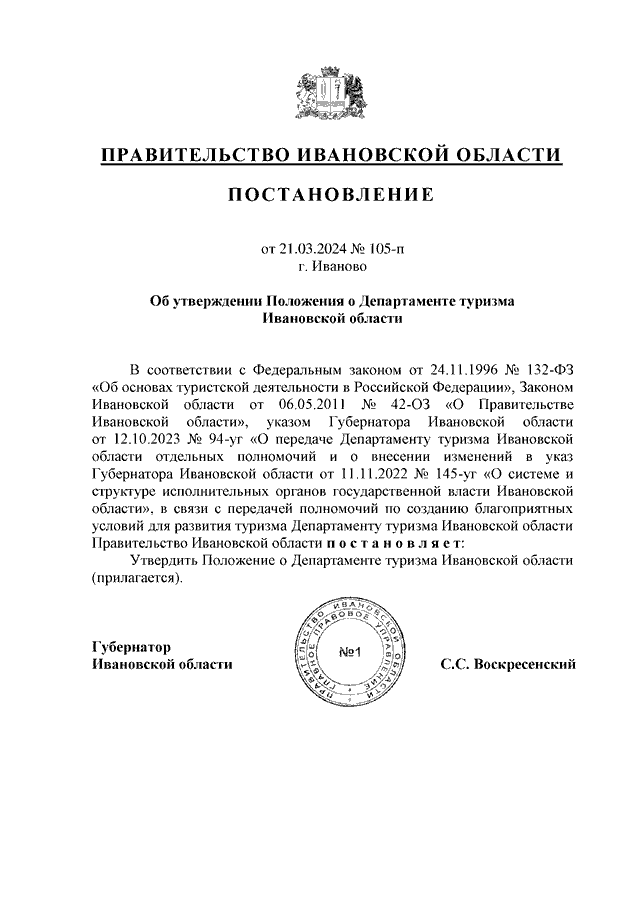 Постановление Правительства Ивановской области от 21.03.2024 N 105-п "Об утверждении Положения о Департаменте туризма Ивановской области"