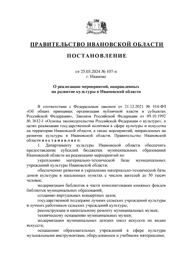 Постановление Правительства Ивановской области от 25.03.2024 N 107-п "О реализации мероприятий, направленных на развитие культуры в Ивановской области"