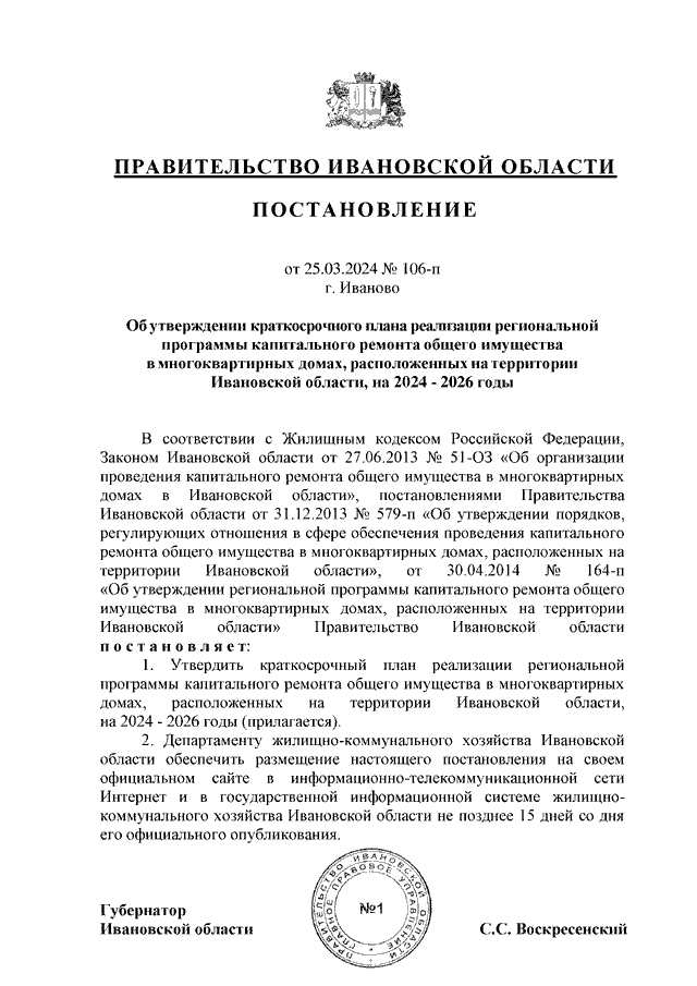 Постановление Правительства Ивановской области от 25.03.2024 N 106-п "Об утверждении краткосрочного плана реализации региональной программы капитального ремонта общего имущества в многоквартирных домах, расположенных на территории Ивановской области, на 2024 - 2026 годы"