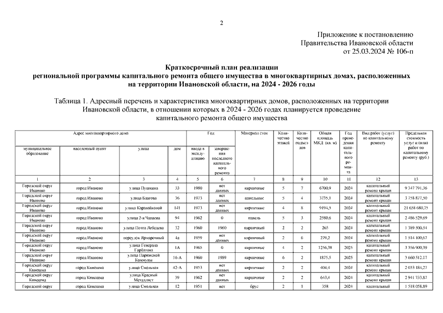 Постановление Правительства Ивановской области от 25.03.2024 N 106-п "Об утверждении краткосрочного плана реализации региональной программы капитального ремонта общего имущества в многоквартирных домах, расположенных на территории Ивановской области, на 2024 - 2026 годы"
