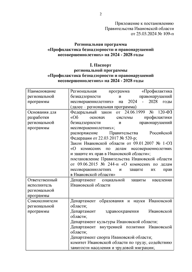 Постановление Правительства Ивановской области от 25.03.2024 N 109-п "Об утверждении региональной программы "Профилактика безнадзорности и правонарушений несовершеннолетних" на 2024 - 2028 годы"