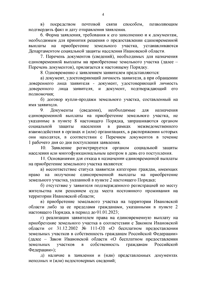 Постановление Правительства Ивановской области от 26.03.2024 N 111-п "О внесении изменений в некоторые постановления Правительства Ивановской области" (вместе с "Порядком предоставления единовременной денежной выплаты на приобретение земельного участка для индивидуального жилищного строительства, ведения личного подсобного хозяйства")